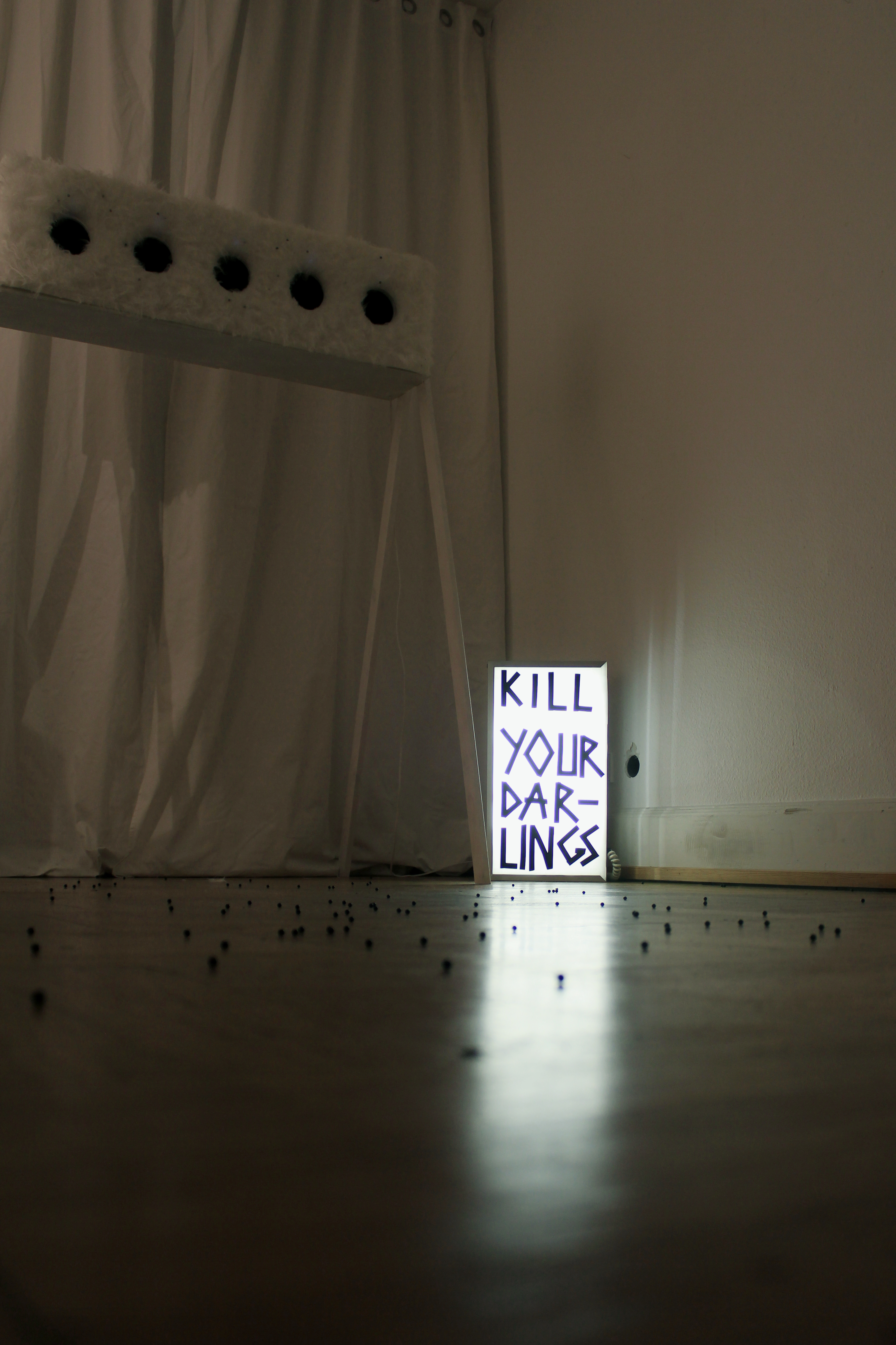 Kernstück von KILL YOUR DARLINGS ist ein Schießstand, dessen fünf Zielscheiben jeweils einem der fünf literarischen Hauptthemen »Ich«, »Liebe«, »Gott«, »Versuchung« und »Tod« zugeordnet sind.