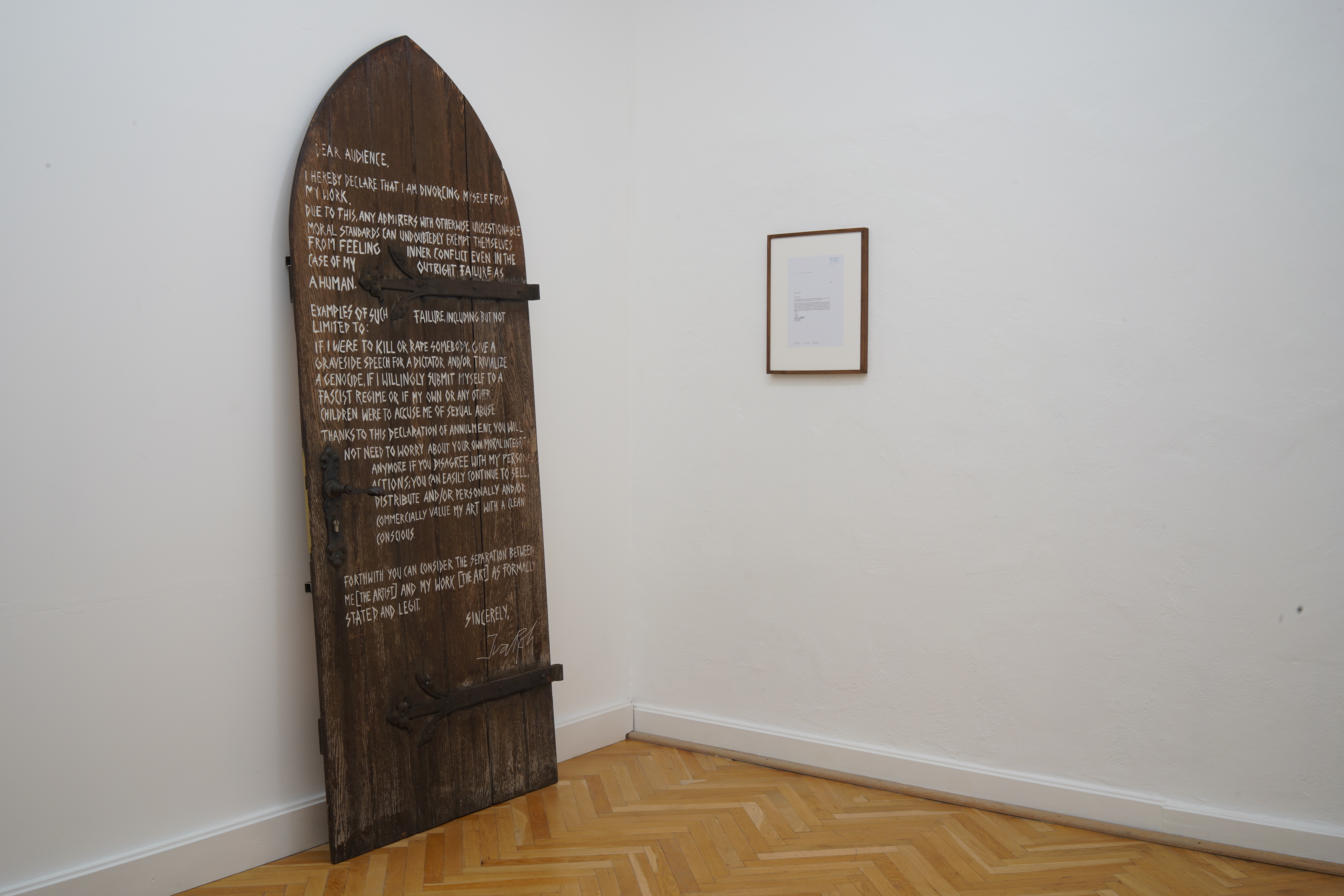 Die Arbeit „as a matter of fact” lenkt den Blick zunächst auf eine Kirchentür mit einem eingefassten Text. In direkter Ansprache an das Publikum verkündet die Künstlerin darin, dass sie sich von ihrem Werk trennt. Der häufig angewendete kulturtheoretische Ansatz der notwendigen Trennung zwischen Werk und Autor*in, bzw. Kunst und Künstler*in erhält durch diese künstlerische Umformulierung der Theorie in die Praxis vermeintlich offizielle Legitimation. Neben der Tür hängt jedoch antagonistisch das gerahmte Dokument eines Notars, welches direkten Bezug auf die Verkündung der Künstlerin nimmt. Ebenfalls in direkter Ansprache an das Publikum wird hier ein deutlicher Warnhinweis ausgesprochen: Die Trennung von Künstler*in und Werk ist juristisch unmöglich und damit eben keinesfalls – im Wortsinn – legitim. Rohr lässt hier formal-symbolisch zwei Argumentations-linien in absurder Konsequenz aufein-andertreffen, die für sie die strukturelle Problematik des Geniekonstrukts verdeutlichen und die Widersprüchlichkeit der dazugehörigen Rechtfertigungsrethorik aufzeigen. An die Stelle der Person tritt in dieser Aufstellung das Werk und eine Lesart,